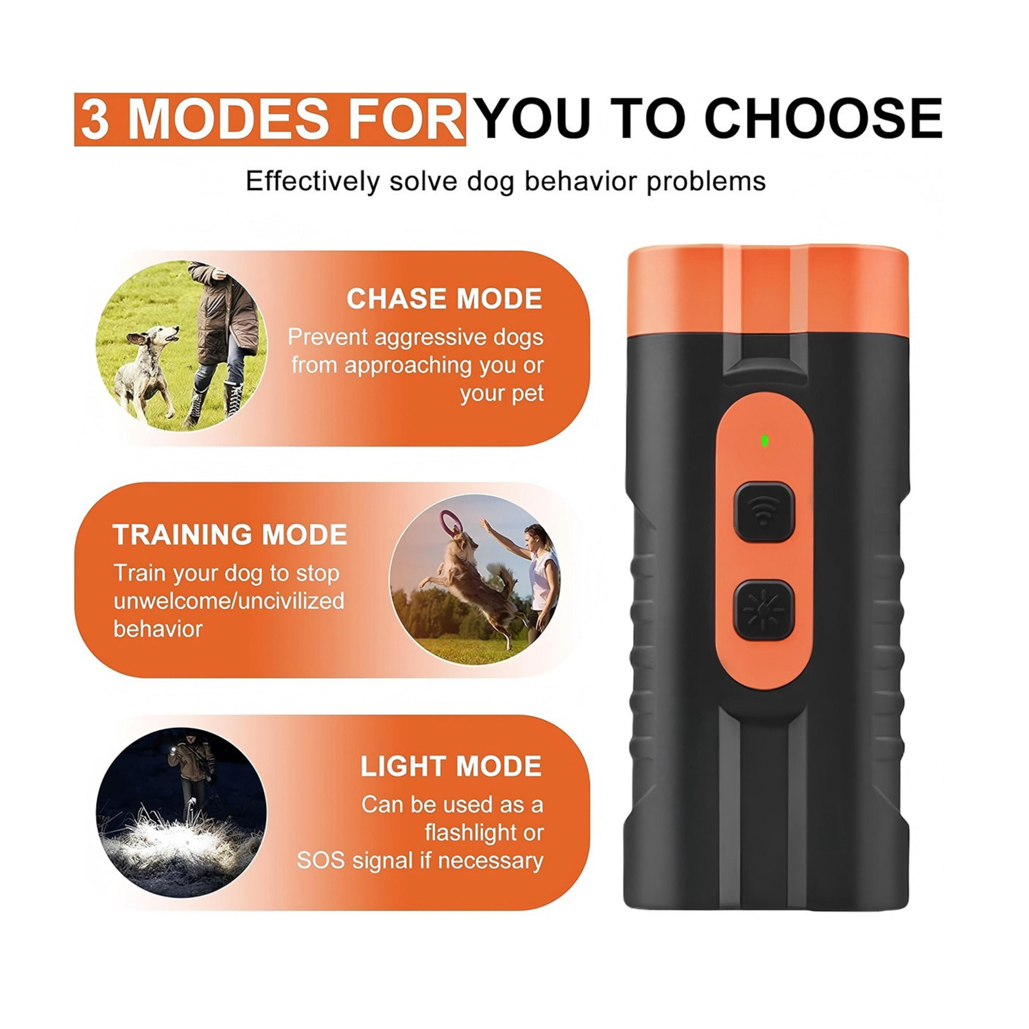 Unlock the full potential of your dog’s training with three powerful modes in one compact device. Whether you're correcting behavior, reinforcing obedience, or ensuring safety during night time walks, our device has everything you need.